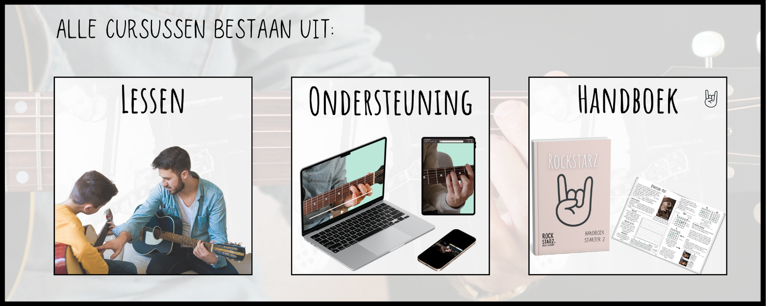 Uiteraard krijg je volledige ondersteuning via Rockstarz Online, zodat je elke les thuis kunt herhalen en op je eigen tempo kunt blijven oefenen. Bovendien ontvang je het Electric 2-handboek, boordevol oefeningen, uitleg, tabs en inspirerende voorbeelden.